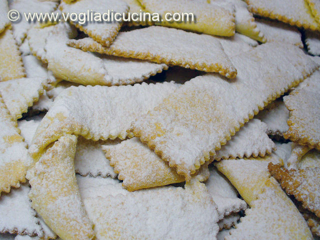 Ricavare le chiacchiere nella forma desiderata con l'aiuto di una rotella tagliapasta, disporle sulla teglia distanziate tra loro e passare in forno caldo. Cuocere per 10 minuti circa o sino a lieve doratura. Estrarre la teglia dal forno, disporre le chiacchiere su un vassoio e, quando saranno tiepide, spolverizzarle con zucchero a velo.