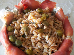 Tortino di farro con capperi, peperoni e prosciutto crudo
