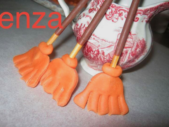 Con gli altri tocchetti di pasta di zucchero rimasti, realizzate un lungo cordoncino sottile, avvolgete le scopette in corrispondenza dell'apertura dove si infila il bastoncino.